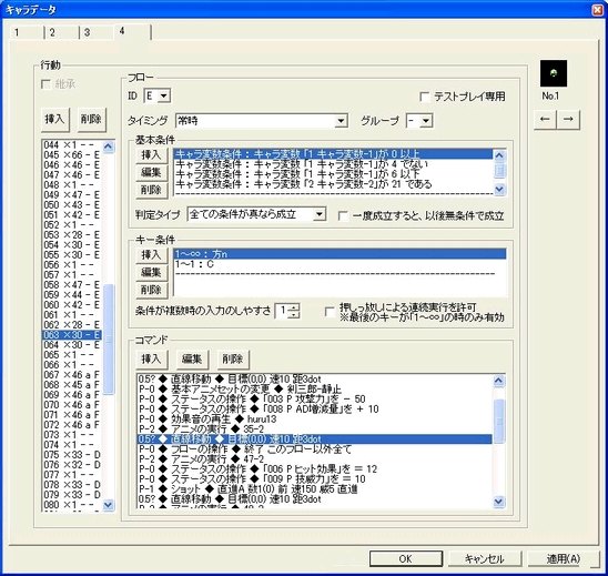 アクエディ界1の体脂肪率といっても過言ではないでしょう。冗談抜きにエディターが固まりかねません。というか実際にちょっと重い。というわけでもっと組み方を工夫する必要が出てきました。攻撃の1ヒットごと、バウンドの種類別、それぞれ1つずつ処理数14~35くらいのフローがあるんです。キャラが増えるとそれだけ増加。フロー数4ケタも行きかねない。これを変数指定するだけで作れるようにパターン化しないといけません。面倒くさそうです。